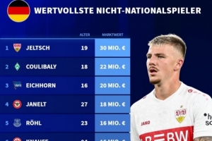 体育资讯3月24日讯 德国转会市场统计了从未入选德国队名单的球员身价,并列出榜单。