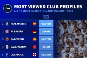 体育资讯4月3日讯 德国转会市场统计了3月份俱乐部页面的浏览量,并列出榜单,皇马居首,巴萨、拜仁排名二三位。