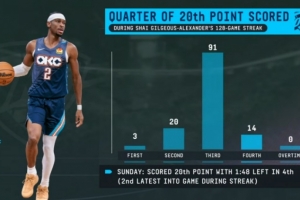 恐怖如斯!SGA连续128场20+分布图:114次前三节拿到 末节14次